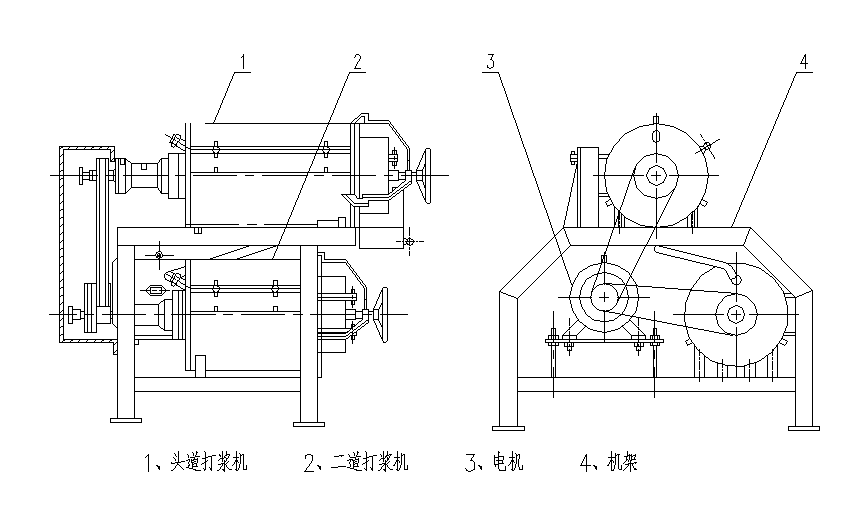 ★ 主要結構:傳動系統(tǒng)、軸承座、套軸、筒后蓋、擋漿盤、筒身、花鍵軸、篩網(wǎng)、刮板(或打漿棒)、筒前蓋、機架等