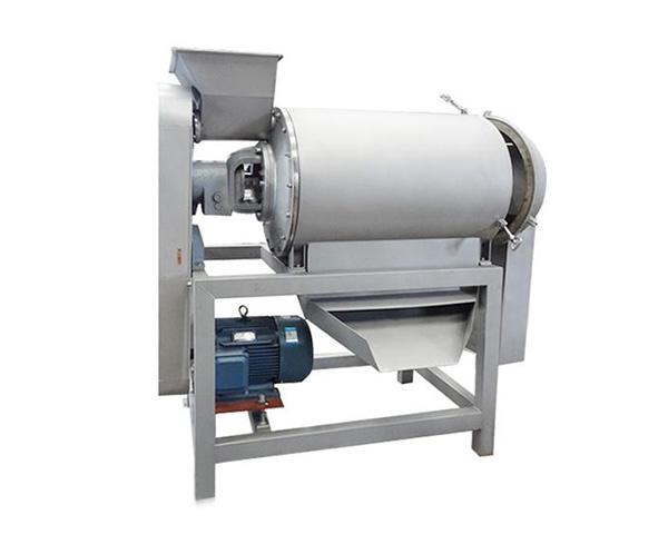 電機(jī)通過(guò)三角帶傳動(dòng),使安裝在花鍵軸上的刮板高速旋轉(zhuǎn),當(dāng)經(jīng)過(guò)破碎的水果通過(guò)進(jìn)料口進(jìn)入機(jī)內(nèi)時(shí),擋漿盤(pán)將物料均勻排發(fā)到刮板和篩網(wǎng)之間,由于刮板的回轉(zhuǎn)作用和導(dǎo)程角的存在,使物料沿著園筒向出口端移動(dòng),移動(dòng)的軌跡呈螺旋狀,物料就在刮板和篩網(wǎng)之間移動(dòng)過(guò)程中受離心力的作用而被擦碎,汁液和肉質(zhì)(已成漿狀)從篩孔通過(guò)進(jìn)入下道工序(雙道打漿機(jī)為聯(lián)動(dòng)重復(fù)上列過(guò)程),皮和籽等則從出渣斗排出,從而達(dá)到自動(dòng)分離的目的。只要變換不同規(guī)格的篩網(wǎng)以及調(diào)整刮板導(dǎo)程角的大小,可改變不同的打漿速度,獲滿(mǎn)意的效果。