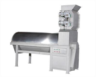 石榴從進(jìn)料斗進(jìn)入上壓碎裝置,上壓碎裝置將石榴壓開,下壓碎裝置再次將石榴擠壓,經(jīng)過兩級擠壓的石榴已基本皮籽分離,并落入分離裝置,石榴籽從篩孔落下,皮從尾部排出, 籽及汁用另配的螺桿泵送至下道工序。