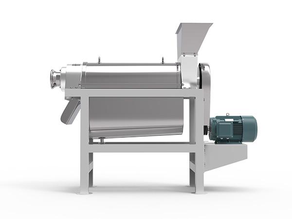 ★ 原料加入進(jìn)料斗中,在螺旋的推進(jìn)下受壓,其壓榨的汁液通過過濾網(wǎng)流入底部的盛汁器,而渣則通過螺旋與調(diào)壓頭的錐形部分之間形成的環(huán)狀空隙排出,調(diào)壓頭沿軸向的移動可調(diào)整空隙的大小。用手順時針(從設(shè)備的出渣槽向進(jìn)料斗端看)轉(zhuǎn)動手輪軸承座時,調(diào)壓頭向左,空隙即縮小,反之則空隙變大。改變孔隙的大小,即調(diào)整排渣的阻力,即可改變出汁率。但如果孔隙過小,在強(qiáng)力擠壓下,部分渣的顆粒會和汁一起通過過濾網(wǎng)被擠出,盡管出汁率增加,但汁的質(zhì)量相對下降,因此孔隙的大小應(yīng)視用戶的具體工藝要求而定。