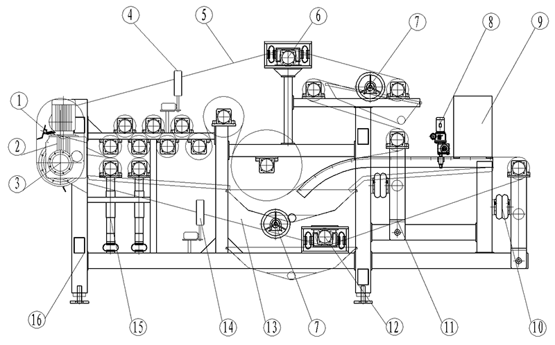 見附示意圖, 該機有機架、上下驅(qū)動軸,減速驅(qū)動總成,壓輥組合,壓濾帶、清洗帶組件、進(jìn)料組件、漲緊裝置、帶糾偏組件、增壓裝置、安全保護(hù)裝置,氣電控制裝置、清洗水過濾裝置等組成。